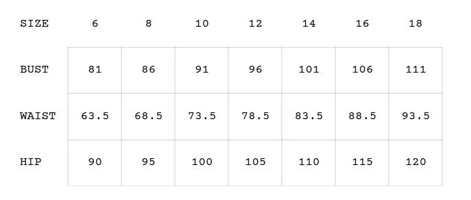 Garment Length 57cm for size 8, add Xcm for each size.